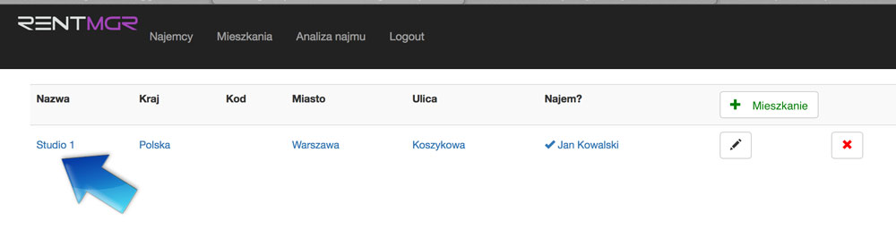 OK. Mamy już mieszkanie i najemcę. Pora dodać rachunki, przychody i podatki przypisane do mieszkania. W tym celu klikamy w nazwę mieszkania.