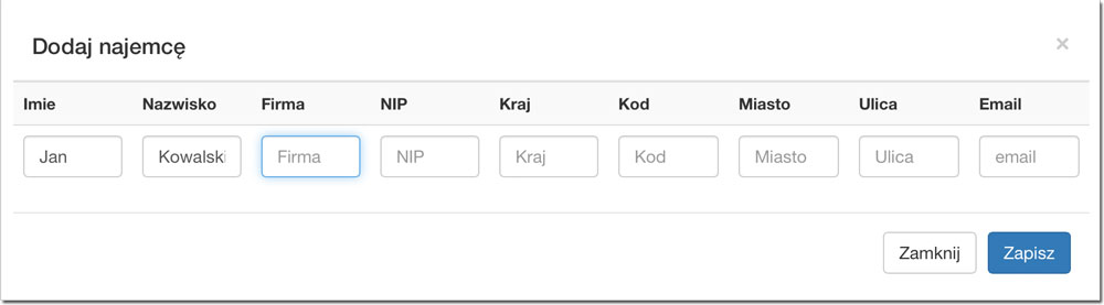 Uzupełnij dane najemcy i kliknij 'Zapisz'