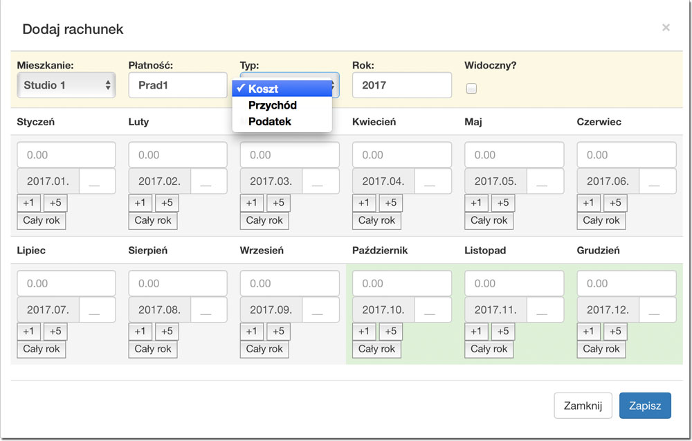 Teraz musimy przyporządkować odpowiednią kategorię. Do wyboru mamy przychod, czyli pieniądze z najmu, koszt czyli nasze rachunki oraz podatek. Wpisujemy wartości i terminy płatności.