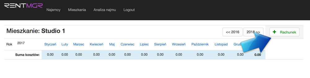 OK. Mamy już mieszkanie i najemcę. Pora dodać rachunki, przychody i podatki przypisane do mieszkania. W tym celu klikamy w nazwę mieszkania.