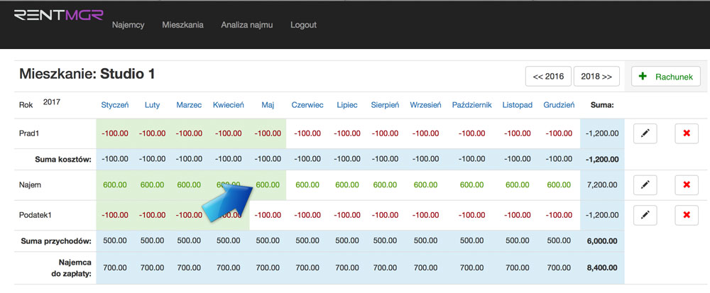 Gdy już wszystko sobie wpiszemy, będziemy widzieć pełny obraz danego roku. Przychody, koszty i znienawidzone podatki. Kliknięcie w dowolną kwotę spowoduje jej podświetlenie. Możemy w ten sposób oznaczyć sobie, że coś już zapłaciliśmy lub nam zostało zapłacone. Kliknięcie w nazwę miesiąca, przy opcji 'najem' wyświetli nam łatwy raport, który możemy skopiować do maila i wysłać najemcy. W przyszłości będzie się to działo samo :-)